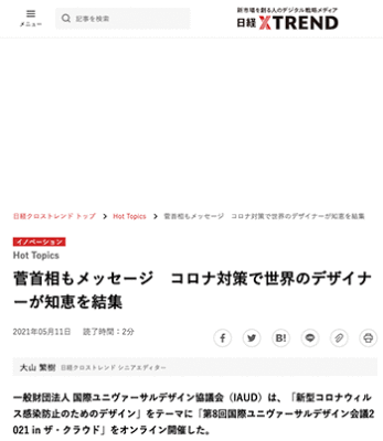 「菅首相もメッセージ コロナ対策で世界のデザイナーが知恵を結集」という「新型コロナウィルス感染防止のためのデザイン」をテーマにしたオンラインでの基調講演とパネルディスカッション「第8回国際ユニヴァーサルデザイン会議2021 in ザ・クラウド」の模様をレポートしている記事が、日経クロストレンドに掲載されています。