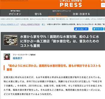 都市防災「水害から家を守れ!画期的な水害対策、船のように水に浮かぶ一条工務店「耐水害住宅」は、普及のためのコストも重視」という一条工務店の取り組みについて取り上げている記事が、LIFULL HOME’S PRESSに掲載されています。
