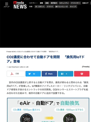 「CO2濃度に合わせて自動ドアを開閉 「換気用IoTドア」登場」というリンクジャパンとエントラックの共同開発による「換気用IoTドア」について取り上げている記事が、ITmedia NEWSに掲載されています。