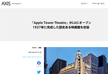 建築「「Apple Tower Theatre」がLAにオープン1927年に完成した歴史ある映画館を改装」というApple Tower Theatreについて取り上げている記事が、AXISに掲載されています。