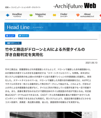 ロボット&ドローン「竹中工務店がドローンとAIによる外壁タイルの浮き自動判定を実用化」という記事が、Archi Future Webに掲載されています。