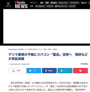 「ゲリラ豪雨の予報にスパコン「富岳」活用へ 理研などが実証実験」という理化学研究所(理研)らで構成する共同研究グループによる実証実験について取り上げている記事が、ITmedia NEWSに掲載されています。