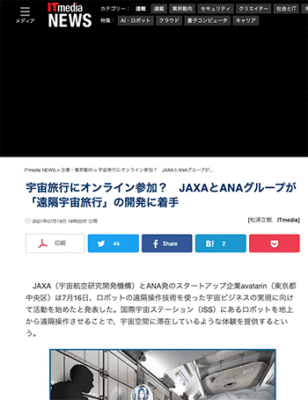 「宇宙旅行にオンライン参加? JAXAとANAグループが「遠隔宇宙旅行」の開発に着手」というJAXAとANA発のスタートアップ企業avatarinの取り組みについて取り上げている記事が、ITmedia NEWSに掲載されています。