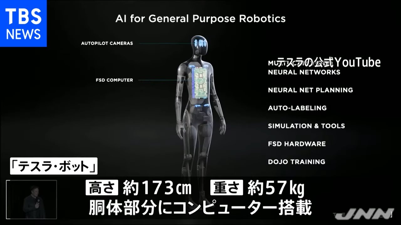 「米テスラ 人型ロボット開発に自動運転技術」というアメリカのテスラが、人型ロボットを開発すること発表したことを伝えている動画ニュースが、youtube(TBS NEWS)にて公開されています。