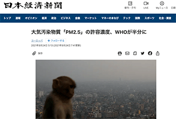 「大気汚染物質「PM2.5」の許容濃度、WHOが半分に」という世界保健機関(WHO)が発表した指針について取り上げている記事が、日本経済新聞に掲載されています。