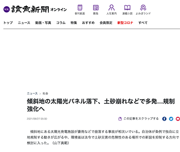 「傾斜地の太陽光パネル落下、土砂崩れなどで多発…規制強化へ」という記事が、読売新聞オンラインに掲載されています。