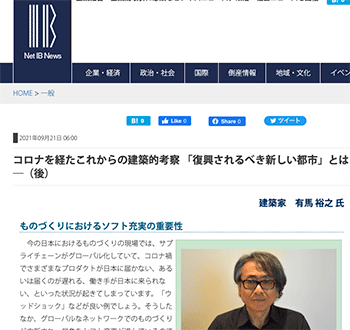 建築「コロナを経たこれからの建築的考察 「復興されるべき新しい都市」とは―」という建築家の有馬裕之氏による記事が、NETIB-NEWSに掲載されています。