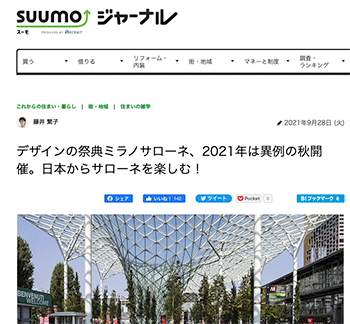 「デザインの祭典ミラノサローネ、2021年は異例の秋開催。日本からサローネを楽しむ!」という2021年9月5日から10日に開催されたミラノサローネ国際家具見本市「Salone del Mobile.Milano」についてまとめレポートしている記事が、スーモジャーナルに掲載されています。
