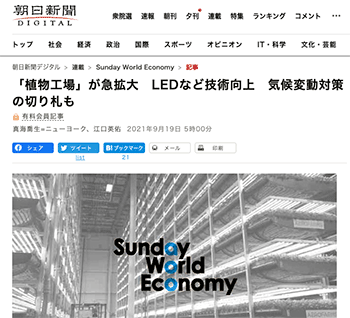プロダクト・設備「「植物工場」が急拡大 LEDなど技術向上 気候変動対策の切り札も」という記事が、朝日新聞デジタルに掲載されています。