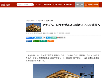 「アップル、ロサンゼルスに新オフィスを建設へ」というアップルのロサンゼルスでの新オフィス計画について取り上げている記事が、CNET Japanに掲載されています。