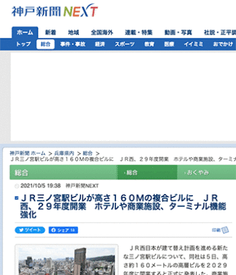 まちづくり「JR三ノ宮駅ビルが高さ160Mの複合ビルに JR西、29年度開業 ホテルや商業施設、ターミナル機能強化」というJR西日本が建て替え計画を進める新たな三ノ宮駅ビルの計画について取り上げている記事が、神戸新聞NEXTに掲載されています。