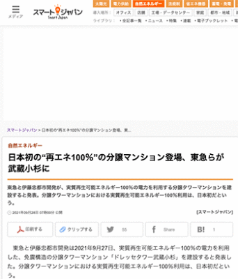 「日本初の“再エネ100%”の分譲マンション登場、東急らが武蔵小杉に」という東急と伊藤忠都市開発による取り組みについて取り上げている記事が、スマートジャパンに掲載されています。