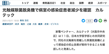 「光触媒除菌脱臭機で病室の感染症患者減少を確認 カルテック」というカルテックと日本大学医学部との共同研究の内容について取り上げている記事が、産経ニュースに掲載されています。