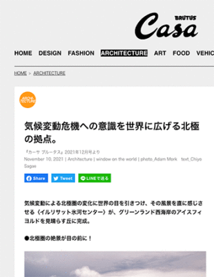 「気候変動危機への意識を世界に広げる北極の拠点。」というデンマークの女性建築家ドルテ・マンドルップによるイルリサット氷河センターについて取り上げている記事が、Casa BRUTUSに掲載されています。