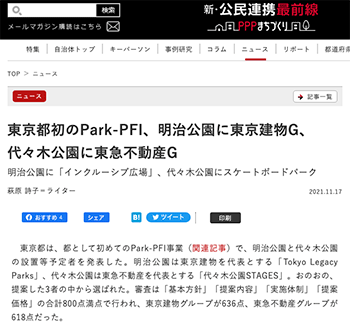 →『東京都初のPark-PFI、明治公園に東京建物G、代々木公園に東急不動産G』