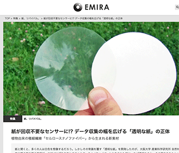 「紙が回収不要なセンサーに!? データ収集の幅を広げる「透明な紙」の正体」という大阪大学産業科学研究所自然材料機能化研究分野の能木雅也教授が開発した「透明な紙」について取り上げている記事が、EMIRAに掲載されています。