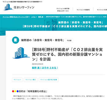 「[第58号]野村不動産が「CO2排出量を実質ゼロにする、国内初の新築分譲マンション」を計画」という細野透氏による記事が、住まいサーフィンに掲載されています。