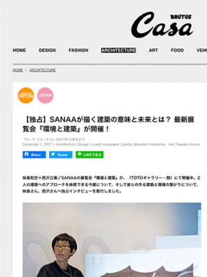 アート・展覧会「【独占】SANAAが描く建築の意味と未来とは? 最新展覧会『環境と建築』が開催!」という妹島和世+西沢立衛/SANAAの展覧会『環境と建築』について取り上げている記事が、Casa BRUTUSに掲載されています。