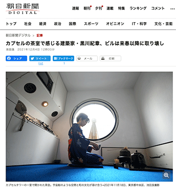 「カプセルの茶室で感じる建築家・黒川紀章、ビルは来春以降に取り壊し」という記事が、朝日新聞デジタルに掲載されています。
