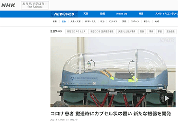 「コロナ患者 搬送時にカプセル状の覆い 新たな機器を開発」という大阪大学の附属病院による開発について取り上げている動画ニュースが、NHKニュースにて公開されています。