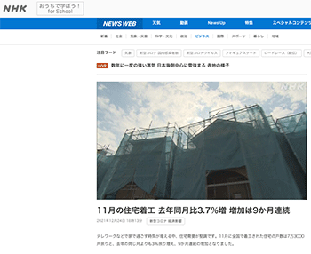 「11月の住宅着工 去年同月比3.7%増 増加は9か月連続」という国土交通省の発表に関して取り上げている記事が、NHKニュースに掲載されています。