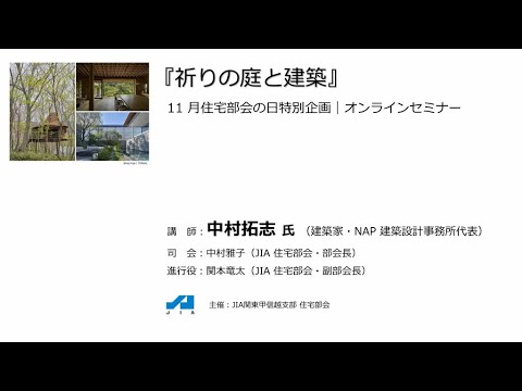 「住宅部会の日・特別企画『祈りの庭と建築』中村拓志氏 オンラインセミナー」というオンラインセミナー『祈りの庭と建築』(講師:中村拓志氏、司会:中村雅子氏、進行役:関本竜太氏)の模様を録画している動画が、youtube(JIA 関東甲信越支部住宅部会)にて公開されています。