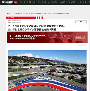 →『F1、9月に予定していたロシアGPの開催中止を発表。ロシアによるウクライナ軍事侵攻を受け決断』