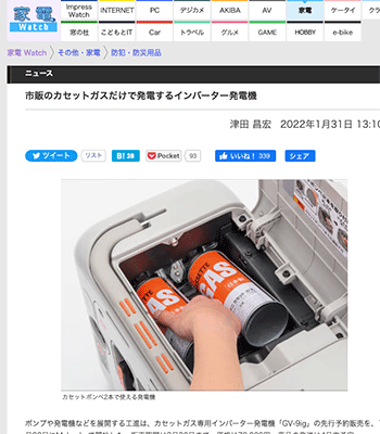 プロダクト・設備「市販のカセットガスだけで発電するインバーター発電機」という記事が、家電 Watchに掲載されています。
