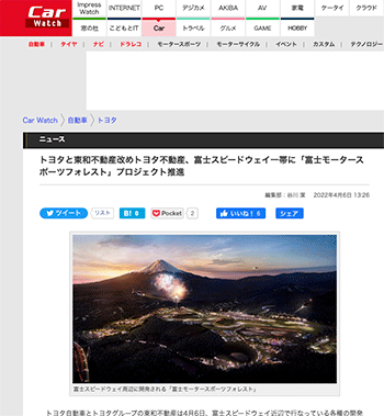まちづくり「トヨタと東和不動産改めトヨタ不動産、富士スピードウェイ一帯に「富士モータースポーツフォレスト」プロジェクト推進」というトヨタとトヨタ不動産による「富士モータースポーツフォレスト」の取り組みについて取り上げている記事が、Car Watchに掲載されています。