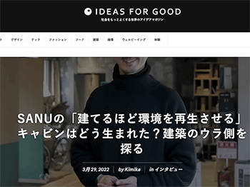 建築「SANUの「建てるほど環境を再生させる」キャビンはどう生まれた?建築のウラ側を探る」というSANUの取り組みについて取り上げている記事が、IDEAS FOR GOODに掲載されています。