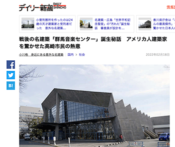 建築「戦後の名建築「群馬音楽センター」誕生秘話 アメリカ人建築家を驚かせた高崎市民の熱意」という記事が、デイリー新潮に掲載されています。