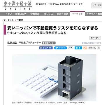 不動産動向「安いニッポンで不動産買うリスクを知らなすぎる」という牧野知弘氏による記事が、東洋経済オンラインに掲載されています。