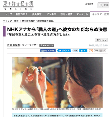 アラカルト「NHKアナから「職人の道」へ彼女のただならぬ決意 「年齢を重ねることを喜べる生き方がしたい」」という記事が、東洋経済オンラインに掲載されています。