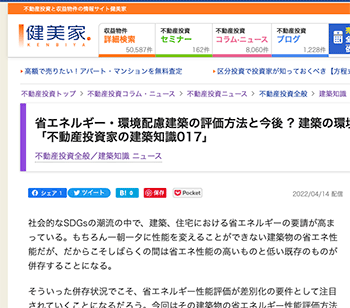 「省エネルギー・環境配慮建築の評価方法と今後 ? 建築の環境スペックのメリット 「不動産投資家の建築知識017」」という新堀学氏による記事が、不動産投資の健美家に掲載されています。