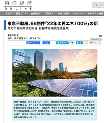 「東急不動産、66物件「22年に再エネ100%」の訳 電力の社内循環を実現、目指すは環境先進企業」という記事が、東洋経済オンラインに掲載されています。