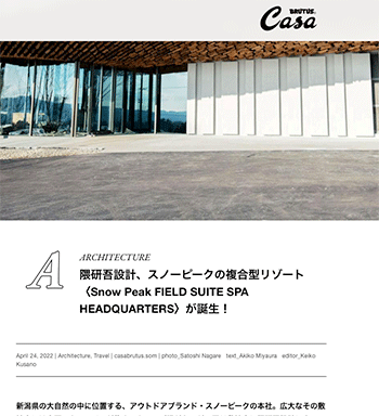 「隈研吾設計、スノーピークの複合型リゾート〈Snow Peak FIELD SUITE SPA HEADQUARTERS〉が誕生!」という隈研吾氏の設計による複合型リゾート「Snow Peak FIELD SUITE SPA HEADQUARTERS」について取り上げている記事が、 Casa BRUTUSに掲載されています。
