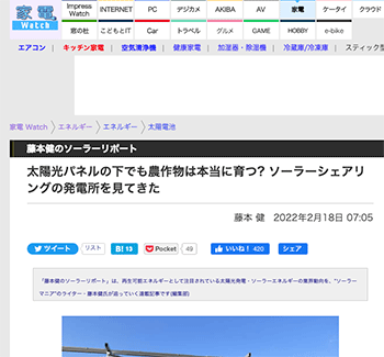 プロダクト・設備「太陽光パネルの下でも農作物は本当に育つ? ソーラーシェアリングの発電所を見てきた」という記事が、家電 Watchに掲載されています。
