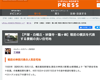 都市とメディア「【戸塚・白幡丘・妙蓮寺・鶴ヶ峰】戦前の横浜を代表する景観の良い住宅地」という三浦展氏による記事が、LIFULL HOME’S PRESSに掲載されています。