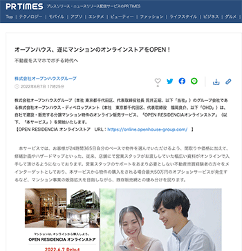 プロダクト・設備「オープンハウス、遂にマンションのオンラインストアをOPEN!」というオープンハウスの取り組みについて取り上げている記事が、PR TIMESに掲載されています。