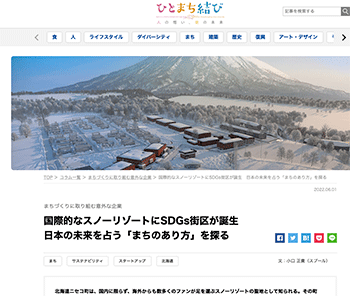 まちづくり「国際的なスノーリゾートにSDGs街区が誕生 日本の未来を占う「まちのあり方」を探る」という北海道ニセコ町での取り組みについて取り上げている記事が、ひとまち結びに掲載されています。