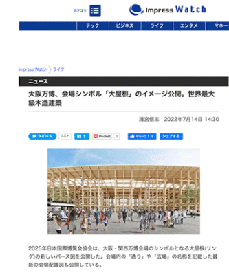 「大阪万博、会場シンボル「大屋根」のイメージ公開。世界最大級木造建築」という2025年日本国際博覧会協会が、大阪・関西万博会場のシンボルとなる大屋根(建築家の藤本壮介氏によるデザイン)の新しいパース図を公開されたことを伝えている記事が、Impress Watchに掲載されています。