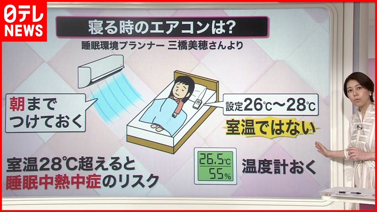 【解説】“睡眠中の熱中症”要注意! 睡眠環境プランナーによる「夜のエアコン活用法」とは?/動画(youtube/ 日テレNEWS) ジャーナル 2022.07.172025.10.23 「【解説】“睡眠中の熱中症”要注意! 睡眠環境プランナーによる「夜のエアコン活用法」とは?」という動画ニュースが、youtube(日テレNEWS)にて公開されています。
