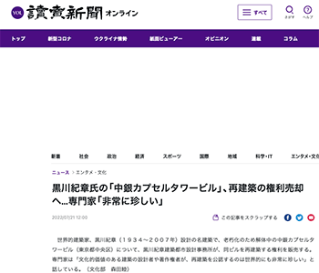 「黒川紀章氏の「中銀カプセルタワービル」、再建築の権利売却へ…専門家「非常に珍しい」」という黒川紀章建築都市設計事務所の取り組みについて取り上げている記事が、読売新聞オンラインに掲載されています。