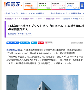 「日本初の木造ハイブリットビル「KITOKI」日本橋兜町に完成~都市建築における木の可能性を拓く」という木造ハイブリットビル「KITOKI」について取り上げている記事が、健美家に掲載されています。