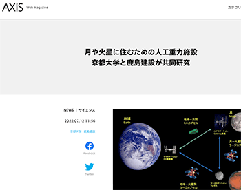 「月や火星に住むための人工重力施設 京都大学と鹿島建設が共同研究」という京都大学と鹿島建設による共同研究について取り上げている記事が、AXISに掲載されています。