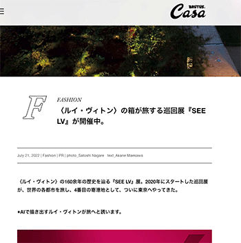 「〈ルイ・ヴィトン〉の箱が旅する巡回展『SEE LV』が開催中。」という『SEE LV』展について取り上げている記事が、カーサ ブルータス に掲載されています。