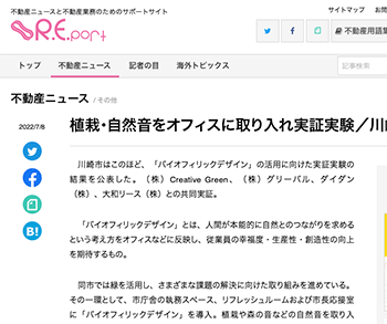まちづくり「植栽・自然音をオフィスに取り入れ実証実験/川崎市」という川崎市による実証実験について取り上げている記事が、R.E.portに掲載されています。