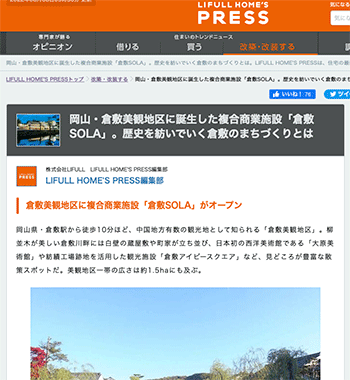 まちづくり「岡山・倉敷美観地区に誕生した複合商業施設「倉敷SOLA」。歴史を紡いでいく倉敷のまちづくりとは」という記事が、LIFULL HOME’S PRESSに掲載されています。
