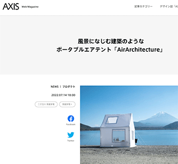 「風景になじむ建築のようなポータブルエアテント「AirArchitecture」」というポータブルエアテント「AirArchitecture」について取り上げている記事が、axisに掲載されています。