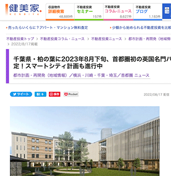 まちづくり「千葉県・柏の葉に2023年8月下旬、首都圏初の英国名門パブリックスクール開校予定!スマートシティ計画も進行中」というつくばエクスプレス「柏の葉キャンパス」駅周辺のまちづくりについて取り上げている記事が、健美家に掲載されています。